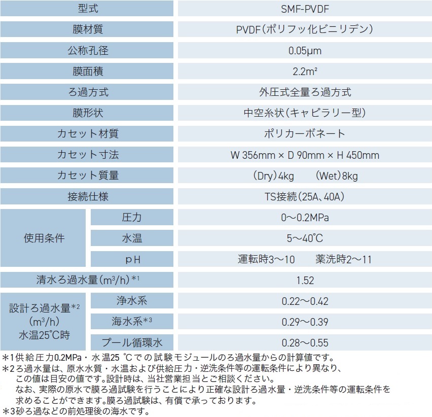 SMF-PVDFは、公称孔径0.05μmのため、飲料水の大敵であるクリプトスポリジウムやジアルジアの除去、温泉施設やクーリングタワーの大敵であるレジオネラの除去が可能