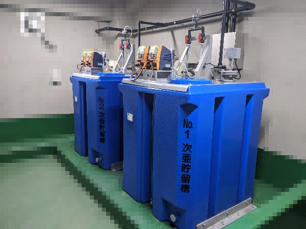 - 配水地の塩素管理装置。浄水場からの送水中に減少した塩素を適切に管理(追加)する設備。