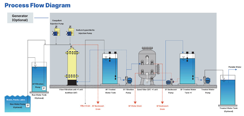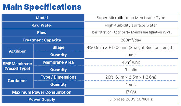 Equipped with ActiFiber® for superior turbidity removal during pre-treatment, the system ensures a stable water supply even from highly turbid rivers. The main filtration unit requires minimal backwash water, reducing overall wastewater discharge.