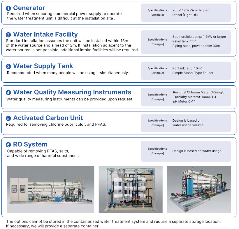 Equipment and devices that are not stored inside the container are available as optional items.