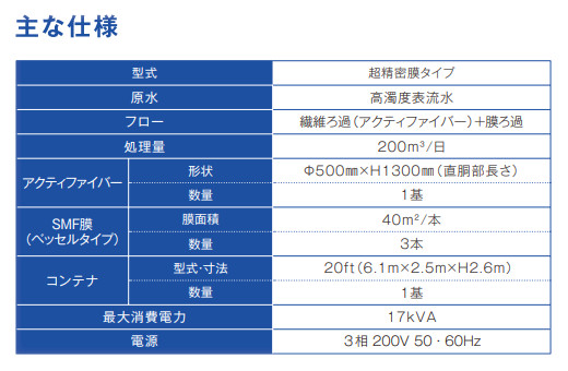 ●前処理には除濁性能に優れるアクティファイバーを採用しており、水源の河川水が高濁度になった場合でも安定した給水を実現します。