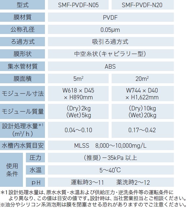 SMF膜の公称孔径は0.05μmなので、処理水の濁度を1度以下にすることができ、後段の砂ろ過等も不要となります。