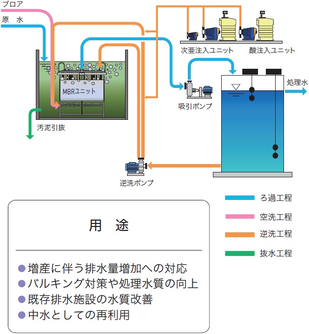 膜分離活性汚泥法(MBR:Membrane Bioreactor)とは、生物処理曝気槽にMF膜(精密ろ過膜)を浸漬させ、吸引ろ過により清澄な水を得る処理方法。