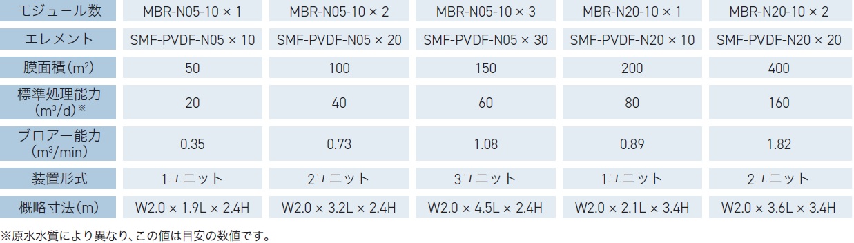 また、従来の生物処理曝気槽のMLSSが約2,000~3,000mg/Lであるのに対し、MBR槽では約8,000~10,000mg/Lと高濃度にすることができるため、効率的な生物処理が可能です。