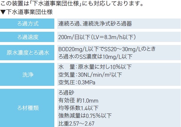 | 処理水 | 水質 | 濁度:10度以下 SS:10mg/L以下 |