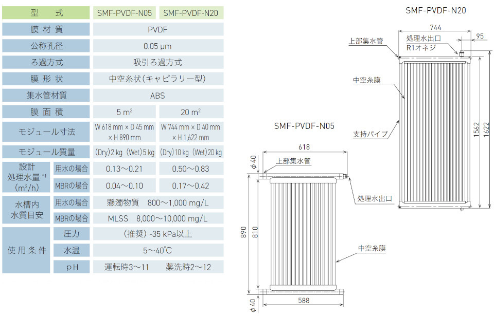 膜面積が20m2/枚と大きく、設備全体を小さくすることができます。